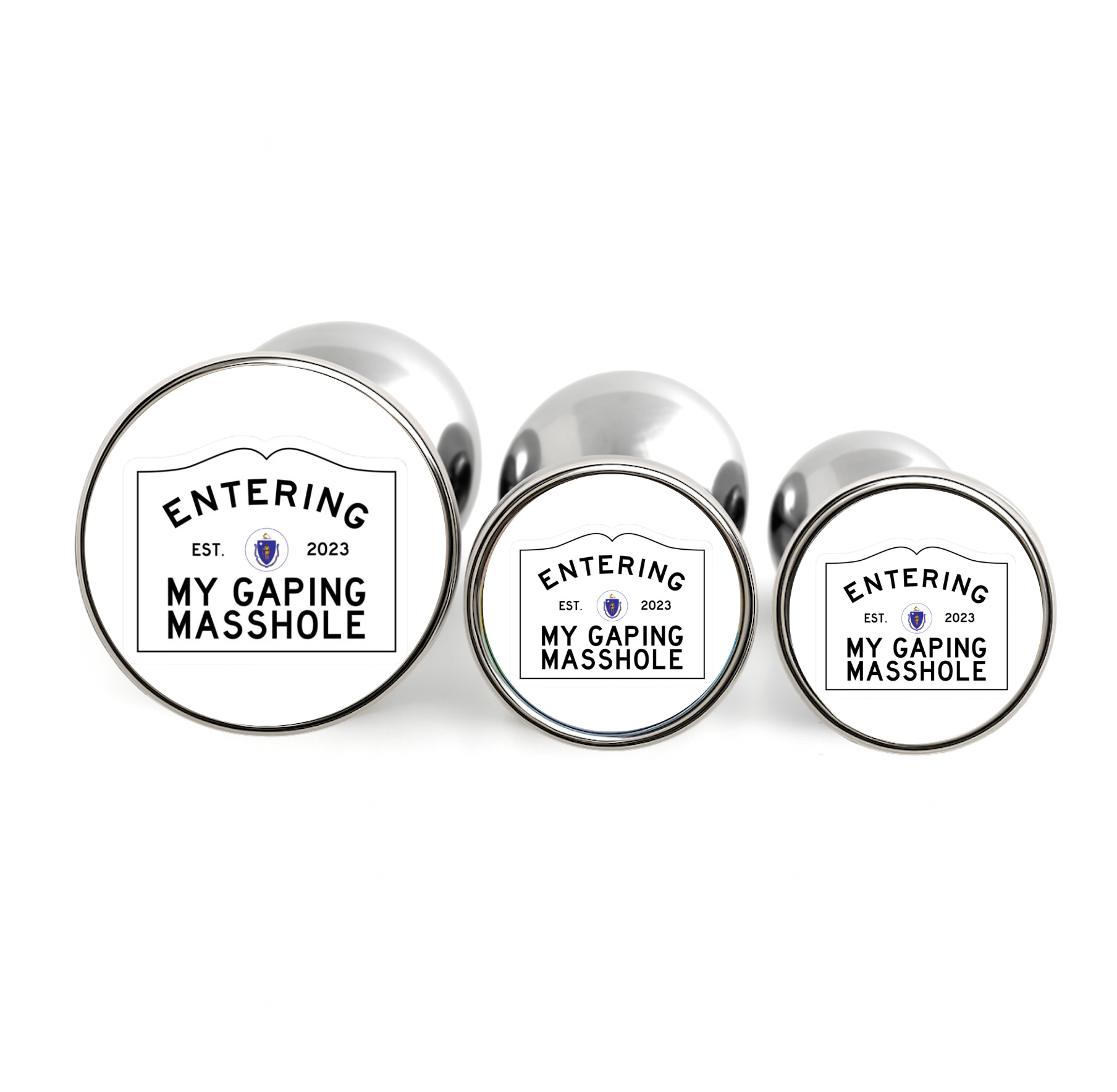 Gape your very own masshole with a "My Gaping Masshole" anal plug! Available in small, medium, and large sizes.